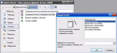 · переключити режим Ассеss на звіти, натиснути кнопку створити, вибрати режим майстер звітів для створення звіту (рис 2.4.1).