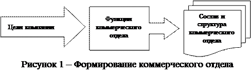 Формирование или реструктуризация коммерческого отдела начинается с ответа на вопрос о том, какие цели ставит перед отделом владелец бизнеса или руководитель компании. Цели коммерческого отдела логически вытекают из целей и задач, стоящих перед компанией в целом. И не только вытекают, но и определяться ими. На основании целей, стоящих перед отделом, формируются функции коммерческого отдела, определяется организационно-управленческая структура и численный состав подразделений, силами которых будут воплощаться в жизнь коммерческие цели компании, в соответствии с рисунком 1.