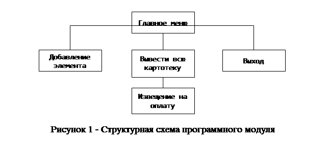 В результате произведённых действий было проверена работоспособность добавления новой записи, вывод картотеки и создание извещения на оплату. Так как при корректном вводе данных на экран не было выведено сообщений об ошибках, испытание можно считать успешным.