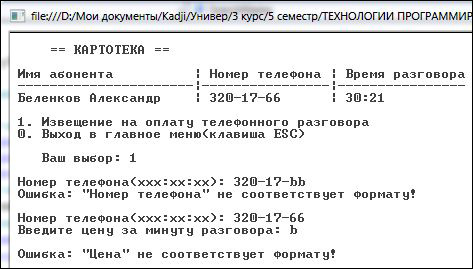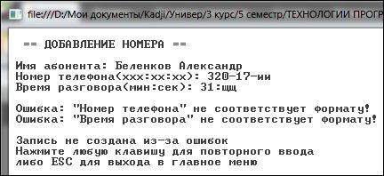 В случае неверного ввода номера телефона, либо цены за минуту разговора, на экран выдаётся сообщение об ошибке ввода.