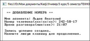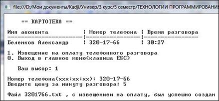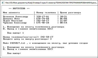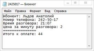 Добавим ещё несколько записей и выведем картотеку путём нажатия «2» в главном меню. Картотека выведена в алфавитном порядке. Все данные соответствуют исходным данным, введённым при добавлении записей. Попытаемся создать извещение на оплату. Выберем «1» и введём номер 242-50-17. Цена минуты разговора равняется 2 рублям. Вводим «2». После окончания ввода данных, на экране отобразиться сообщение (рисунок 9) об успешном создании извещения под именем 2425017.txt (рисунок 10).