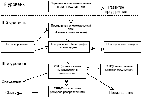 5. Capacity Requirements Planning (CRP)– планирование потребления мощностей. Эту функциональность можно условно отнеси к трем уровням планирования, отражающим иерархию планов в ERP-модели.