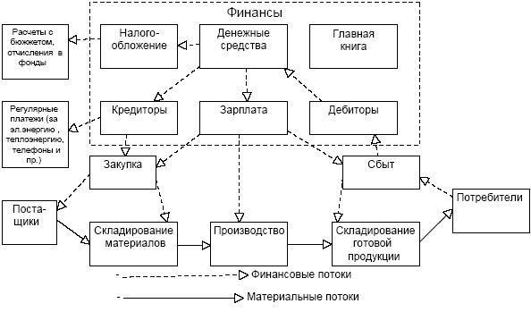 В соответствии с идеологией MRP/ERP эта подсистема полностью интегрирована со всеми остальными и позволяет оперативно получать информацию о финансовых потоках, связанных с потоками материальными, о текущем финансовом состоянии компании, и помогает находить оптимальные финансово - экономические решения. Сквозное управление материальными потоками находит свое отражение в управлении финансовыми потоками (движении денежных средств).