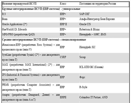 На мировом рынке сейчас предлагается свыше 500 систем класса BMS (в том числе и системы класса MRP II-ERP). Рынок бурно растет - на 35% - 40% каждый год. В настоящее время в России присутствуют около десятка западных систем и три-четыре отечественные информационные системы, которые можно отнести к корпоративным. Для того чтобы понять, кто есть кто на рынке информационных систем для предприятий России, ниже предлагается классификация информационных систем.