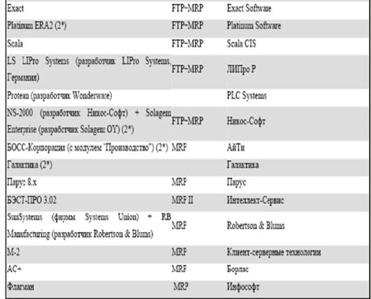 Сейчас практически все современные западные производственные системы и основные системы управления производством базируются на концепции ERP и отвечают её рекомендациям, которые вырабатываются американской общественной организацией APICS, объединяющей производителей, консультантов в области управления производством, разработчиков программного обеспечения. К сожалению, большинство из российских систем управления производством не удовлетворяет пока даже требованиям MRP, не говоря уже обо всех остальных более развитых концепциях.