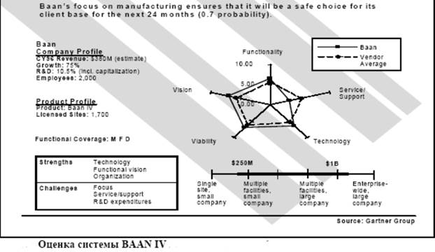 Компания BAAN основана в 1978 г. в Нидерландах. В ней работает около 1000 человек. Система «BAAN» имеет около 7000 внедрений за рубежом; 20 в России из них 2 проекта успешно завершены (Нижфарм – г. Н. Новгород, АО «Элем» - г. Чебоксары). По оценкам внешних экспертов в России только на АО «Элем» удалось выйти на полное использование стандартов MRPII.