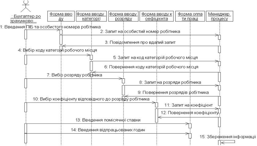 · Діаграма послідовності – служить для моделювання характеристик взаємодії передачі і прийому повідомлень між об'єктами ІС;