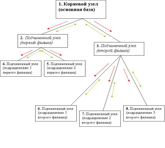 Узел 1 является корневым для всей распределенной базы и главным узлом для подчиненных ему второму и третьему. Второй узел является главным узлом для подчиненных ему четвертому и пятому. Третий узел будет главным для подчиненных ему шестому, седьмому и восьмому.