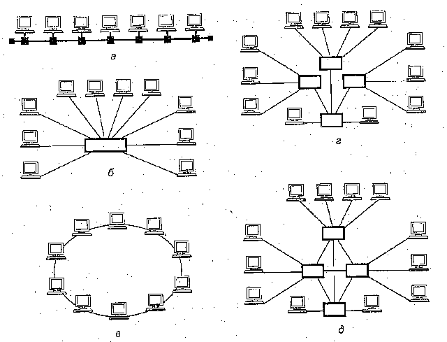 Виды физической топологии: а - шина, б - звезда, в - кольцо, г - дерево, д - сеть
