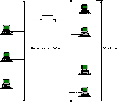 10BASE-2 Коаксиальный кабель с максимальной длиной сегмента 185 м.