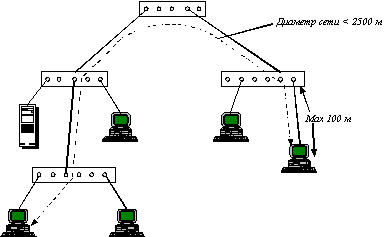 Максимально допустимая длина сегмента. Она зависит от типа используемого кабеля: для витой пары это 100 м, для тонкого коаксиала - 185 м, для толстого коаксиала - 500 м, а для оптоволокна - 2000 м. Для наиболее дешевых и распространенных типов кабеля - витой пары и тонкого коаксиала - это ограничение часто становится весьма нежелательным. Технология Ethernet предлагает использовать для преодоления этого ограничения повторители и концентраторы, выполняющие функции усиления сигнала, улучшения формы фронтов импульсов и исправления погрешностей синхронизации. Однако возможности этих устройств по увеличению максимально допустимого расстояния между двумя любыми узлами сети (которое называется диаметром сети) не очень велики - число повторителей между узлами не может превышать 4-х (так называемое правило четырех хабов). Для витой пары это дает увеличение до 500 м (рисунок 2.2). Кроме того, существует общее ограничение на диаметр сети Ethernet - не более 2500 м для любых типов кабеля и любого количества установленных концентраторов. Это ограничение нужно соблюдать для четкого распознавания коллизий всеми узлами сети, как бы далеко (в заданных пределах) они друг от друга не находились, иначе кадр может быть передан с искажениями.