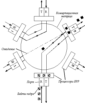 После того, как нужный путь установился, в него направляются буферизованные байты кадра, которые принимаются процессором выходного порта, а после получения им доступа к среде передаются в сеть. Процессор входного порта постоянно хранит несколько байт принимаемого кадра в своем буфере, что позволяет ему независимо и асинхронно принимать и передавать байты кадра (рисунок 2.10).