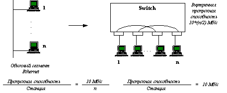 Однако начавшийся процесс вытеснения повторителей и концентраторов коммутаторами говорит о том, что приоритеты изменились, и за повышение общей пропускной способности сети пользователи готовы пойти на издержки, связанные с приобретением коммутаторов вместо концентраторов.