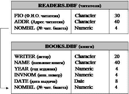 Здесь обе базы данных проиндексированы и связаны по полю NOMBIL, причем одной записи базы данных READERS могут соответствовать несколько записей из базы данных BOOKS (связь «одна-со-многими).
