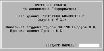 1. Окно, показывающее данные о курсовой работе и ввод пароля.