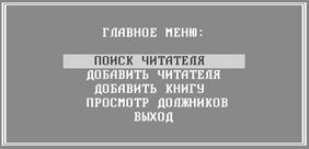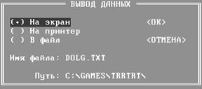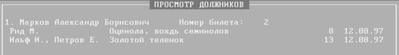 При выборе пункта «просмотр должников» на экране появляется окно запроса для вывода информации: «на экран», «на принтер», «в файл». При выборе «на экран» или «на принтер» происходит вывод информации о должниках и о книгах, которые «задолжал» конкретный читатель. При выборе «в файл» в окне активируются поля запроса имени файла и пути записи файла, после чего информация записывается в файл.