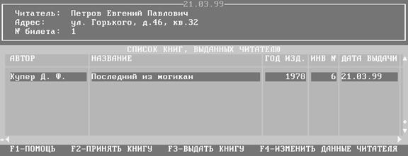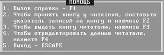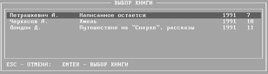 При выборе пункта «поиск читателя» на экран выводится окно поиска по номеру читательского билета. Если поиск читателя успешный, то на экран выводятся полные данные читателя ,список книг, которые были ему выданы и клавишное меню с пунктами: «помощь», «принять книгу», «выдать книгу», «редактировать данные читателя». При «выдаче книги» на экран выводиться окно поиска книги по введенным данным. Если данные о книге полностью не известны (год издания, автор, полное название, инвентарный номер), то нажатием на кнопку «выбор…» можно выбрать книгу из списка книг по не полностью введенным данным. Это очень удобно, если читатель не знает всех данных о желаемой книге. Остальные пункты клавишного меню очень просты в использовании. Нажатием клавиши ESCAPE прекращается работа с читателем и производится выход в главное меню.