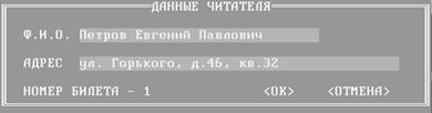 При выборе пункта «добавить читателя» на экране появляется окно, в котором вводятся данные нового читателя. После ввода, читатель становиться как бы «записанным» в библиотеку.