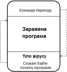 Найпоширенішим засобом зараження файлу вірусом є дописування його тіла у кінець файлу (див. рис. 1). При цьому, щоб при запуску зараженого файлу одразу одержати управління, вірус замість початку файлу, який приховує у своєму тілі, ставить команду переходу на себе. Після того, як вірус відпрацював, він передає управління файлу-жертві. В деяких випадках, якщо в силу тих чи інших причин початок файлу, що інфікується, не зберігається, або є ще якісь "помилки" у вірусі, файл буде зіпсований і його подальше лікування буде неможливим.