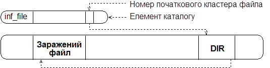 Крім того є віруси, механізм зараження яких суттєво відрізняється від розглянутих вище механізмів. Першим таким вірусом був вірус DIR . Цей вірус не заражував виконувані файли, а лише змінював у каталогах посилання на початок файлу-жертви, так щоб воно тепер вказувало на тіло вірусу, який містився в єдиному екземплярі на всьому диску. Таким чином при запусканні будь-якої зараженої програми вірус одержував управління першим, а після відпрацювання передавав управління запущеній програмі. Схема дії вірусу DIR приводиться на рис. 3.