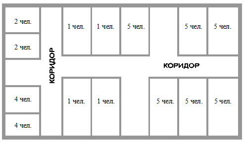 Для решения данной проблемы необходимо выбрать требуемое компьютерное оборудование и спроектировать локальную вычислительную сеть. В организации работает 46 человек, все кабинеты расположены на одном этаже, длина которого составляет 100 м. Размещение людей по кабинетам смотри на схеме.