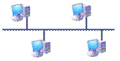 - соединить компьютеры кабелями, по которым происходит передача данных между компьютерами, а также другими подключенными к сети устройствами(принтерами, сканерами и т.д.). В некоторых типах сетей кабели соединяют компьютеры непосредственно (как электролампочки на елочной гирлянде), в других соединение кабелей осуществляется через специальные устройства – концентраторы (или хаб), коммутаторы и др.