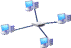 Топология «звезда». Каждый компьютер через сетевой адаптер подключается отдельным кабелем объединяющему устройству. Все сообщения проходят через центральное устройство, которое обрабатывает поступающие сообщения и направляет их к нужным или всем компьютерам.