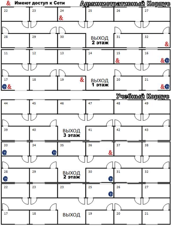 При формировании сети необходимо обеспечить правами пользования локальной сетью и правами доступа в интернет следующие кабинеты: