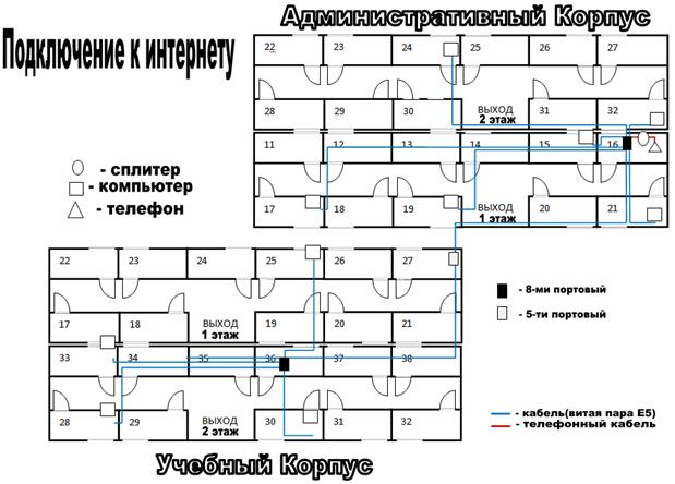Далее необходимо предоставить пользователям локальной сети выход в Интернет. Для этого будем использовать ADSL – технологию из доступных телефонных пар. В данной курсовой работе телефоны имеют секретарь-референт, директор, главный бухгалтер, помещение охраны, отдел кадров, медицинский кабинет.