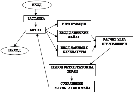 При выполнении операции расчета угла преломления входными данными являются показатели преломления сред и угол падения. Входные данные поступают либо с клавиатуры, либо из файла.