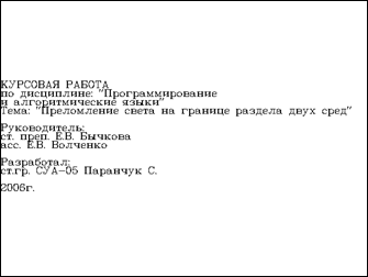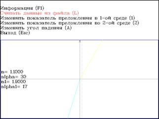 Выходными данными является угол преломления луча. Выходные данные выводятся на экран монитора и в файл.