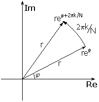 . Его модуль равен единице, а фаза - 2π/N. Как известно, при умножении комплексных чисел, представленных в показательной форме, их модули перемножаются, а аргументы суммируются. Тогда умножение исходного числа на поворачивающий множитель не изменит длину вектора, но изменит его угол. То есть, произойдет поворот