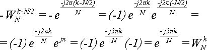 Формула (7) позволяет сократить число умножений вдвое (не считая умножений при вычислении X[even]k и X [odd]k ), если вычислять Xk не последовательно от 0 до N - 1, а попарно: X0 и XN/2 , X1 и XN/2+1 ,..., XN/2-1 и XN . Пары образуются по принципу: Xk и XN/2+k .