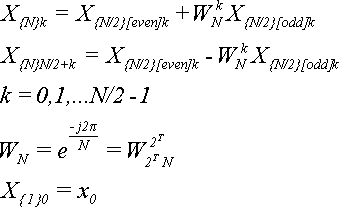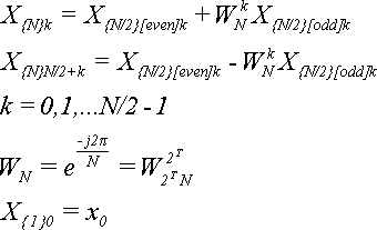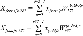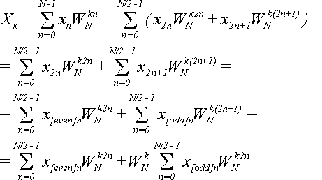 Применяют либо "прореживание по времени" (когда в первую сумму попадают слагаемые с четными номерами, а во вторую - с нечетными), либо "прореживание по частоте" (когда в первую сумму попадают первые N/2 слагаемых, а во вторую - остальные). Оба варианта равноценны. В силу специфики алгоритма приходится применять только N, являющиеся степенями 2. Рассмотрим случай прореживания по времени.
