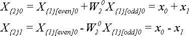 Рассмотрим БПФ для разных N. Для ясности добавим еще один нижний индекс, который будет указывать общее количество элементов последовательности, к которой этот элемент принадлежит. То есть X{R}k - это k-й элемент последовательности {X{R} } из R элементов. X{R}[even]k - это k-й элемент последовательности {X{R}[even] } из R элементов, вычисленный по четным элементам последовательности {X{2R} }. X{R}[odd]k - это k-й элемент последовательности {X{R}[odd] }, вычисленный по нечетным элементам последовательности {X{2R} }.