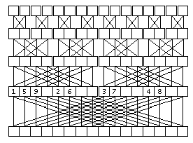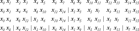 Теперь рассмотрим конкретную реализацию БПФ. Пусть имеется N=2T элементов последовательности x{N} и надо получить последовательность X{N} . Прежде всего, нам придется разделить x{N} на две последовательности: четные и нечетные элементы. Затем точно так же поступить с каждой последовательностью. Этот итерационный процесс закончится, когда останутся последовательности длиной по 2 элемента. Пример процесса для N=16 показан ниже: