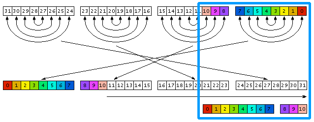 Рассмотрим двоичное представление номеров элементов и занимаемых ими мест. Элемент с номером 0 (двоичное 0000) после всех перестановок занимает позицию 0 (0000), элемент 8 (1000) - позицию 1 (0001), элемент 4 (0100) - позицию 2 (0010), элемент 12 (1100) - позицию 3 (0011). И так далее. Нетрудно заметить связь между двоичным представлением позиции до перестановок и после всех перестановок: они зеркально симметричны. Двоичное представление конечной позиции получается из двоичного представления начальной позиции перестановкой битов в обратном порядке. И наоборот.