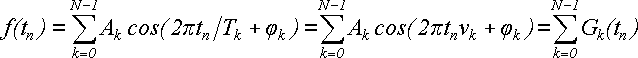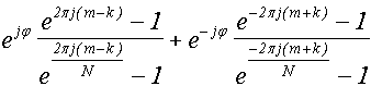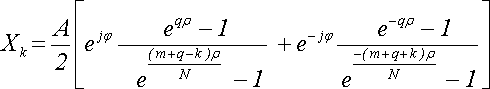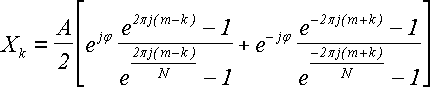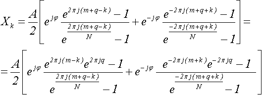 Это значит, что у нас есть две целевые функции, с помощью которых мы можем найти частоту m/T и фазу φ. Возьмем Xk , максимальное по модулю. Если соседние отсчеты Xk-1 и Xk+1 равны нулю, то у нас нет эффекта размазывания и параметры восстанавливаются так, как описано в предыдущей главе. На самом деле нам придется сравнивать не с нулем, а с некоторым малым числом, поскольку некоторая погрешность при вычислении ДПФ неизбежна.