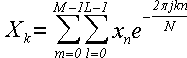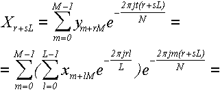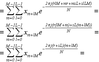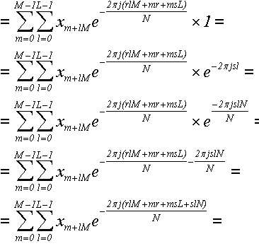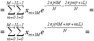 Эта сумма эквивалентна сумме (1), с точностью до перемены мест слагаемых. В самом деле, если n = m + lM, m = 0..M - 1, l = 0..L - 1, N = LM, то переменная n по мере суммирования принимает все значения от 0 до N - 1 ровно по одному разу. Что и требовалось доказать.