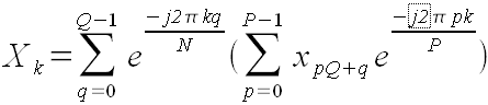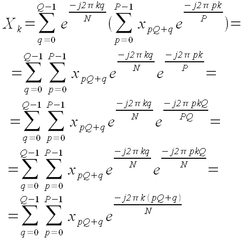 Вернемся к формуле (41). В скобках там стоит обычное прямое БПФ, только не для всех xn , а для последовательности из P штук, взятых с шагом Q. Количество последовательностей равно Q. Элементы последовательности выбираются формулой xpQ + q , где p - номер элемента, q - номер последовательности.
