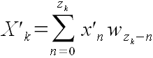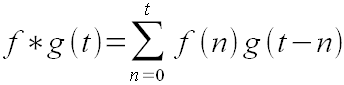 где f и g - функции от целых переменных (т.е. дискретные функции). В данном случае роль таких функций играют x'n и wn , которые "зависят" от своих индексов как от целых переменных. Свертка обладает замечательным свойством: