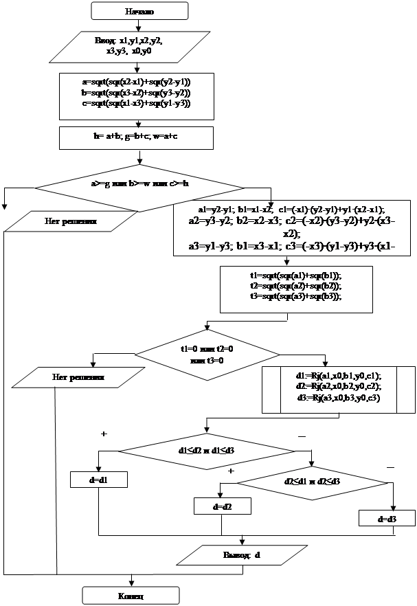 Для решения задачи 1 был разработан алгоритм, представленный в графическом виде. На рисунке 3 (Блок-схема решения задачи1) представлен алгоритм решения задачи в виде блок-схемы, а на рисунке 4 (Блок-схема подпрограммы задачи1) представлена блок-схема подпрограммы для вычисления расстояния до ближайшей стороны.