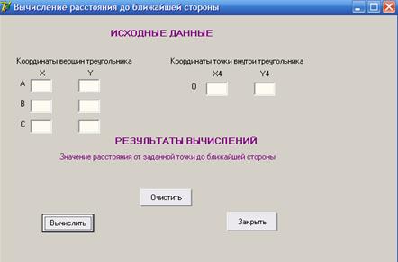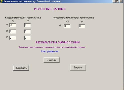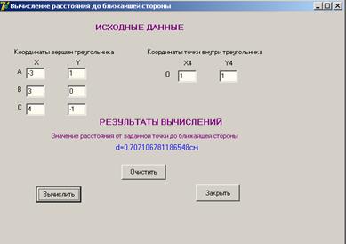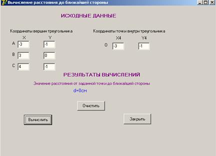 Решение первой задачи основывается на организации вычислительного процесса для нахождения расстояния от заданной точки лежащей внутри заданного треугольника до ближайшей стороны этого треугольника. При решении используется программирование алгоритмов разветвляющейся структуры, реализующихся с помощью оператора условного перехода IF, который служит для изменения порядка выполнения операторов в зависимости от какого-то условия.