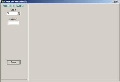 Для решения задачи 2 в Delphi было разработано приложение работы кинематической схемы. Исходный вид окна приложения представлен на рисунке 7 (Исходная форма приложения задачи 2), а на рисунке 8 (Форма приложения кинематической схемы) представлена форма приложения с изображением кинематической схемы, если радиус барабана R=30. Другие варианты работы алгоритма приложения кинематической схемы представлены на рисунке С.11 (Форма приложения кинематической схемы), где радиус барабана R= 40 и на рисунке D.12 (Форма приложения кинематической схемы), где радиус барабана R= 20.