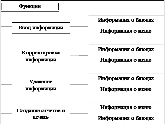 В данной информационной системе, просмотр осуществляется всеми тремя способами. Так же система должна выполнять практически все вышеуказанные функции, но в разном объеме. Необходимо вводить, редактировать и удалять информацию о блюдах и документах меню, просматривать информацию о блюдах и документах меню, предоставлять отчеты, содержащие сведения о меню. При формировании отчетов нужно предусмотреть возможность их распечатать.