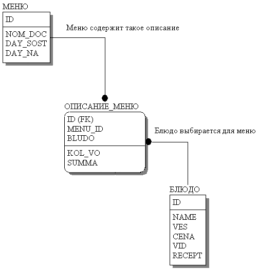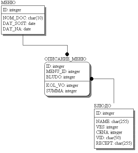 Заведующий производством составляет новое меню (номер документа, дата составления, дата периода составления, описание меню: список блюд, их количество, сумма от количества продажи) из электронного сборника блюд (название блюда, вид, вес, цена, описание компонентов «рецепт»). Сохраняет его в отдельный документ. Документы хранятся в архиве меню. Так же вносит в сборник блюд новые блюда. Задача состоит в проектировании структуры базы данных разрабатываемой автоматизированной информационной системы.