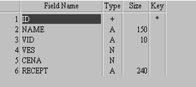 1. Таблица «MENU», создана в приложении программы Delphi 6 DataBaseDesktop. Тип таблицы - Paradox 7.0.