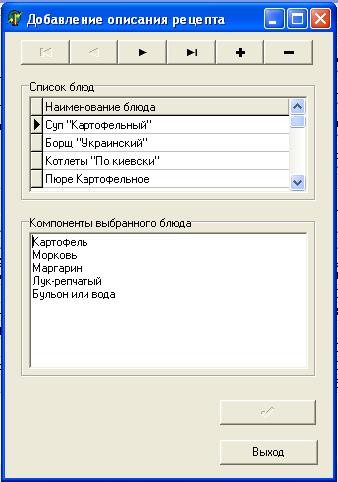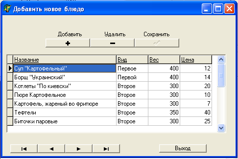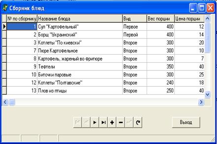 На этой вкладке расположен визуальный элемент DBGrid, позволяющий пользователю наглядно просматривать состав сборника. В верхней части формы, расположены кнопки, служащие для добавления, удаления и сохранения записей в справочнике блюд. В нижней левой части формы, расположен DBNavigator, для осуществления навигации по записям. Для выхода из пункта в правом нижнем углу расположена кнопка «Выход».