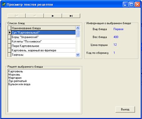 Форма «Просмотр текстов рецептов» служит для просмотра рецепта блюда. Форма содержит DBGrid для отображения списка блюд для выбора, поле с текстом рецепта и дополнительную информацию о блюде.