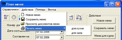 Пункт «Печать меню» состоит из двух подпунктов. Выбрав первый «Печать меню-> для кухни», создастся отчет по плану меню, который находится на главной форме. Этот отчет предназначен для шеф-повара на кухне.